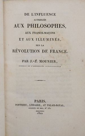 MOUNIER (Jean-Joseph). De l'influence attribuée aux Philosophes, aux Francs-Maçons et aux Illuminés, sur la Révolution de France. Paris, Ponthieu, 1822.