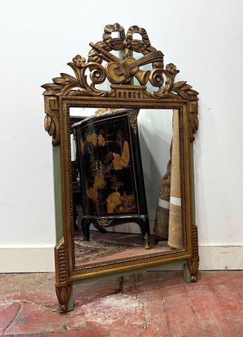 Miroir en bois sculpté et doré, fronton à décor de trophée de mus...