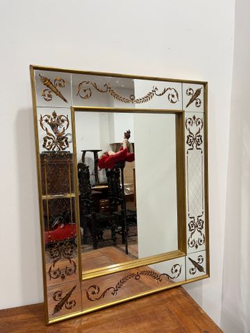 Miroir rectangulaire en verre églomisé à décor de rinceaux, ruban...