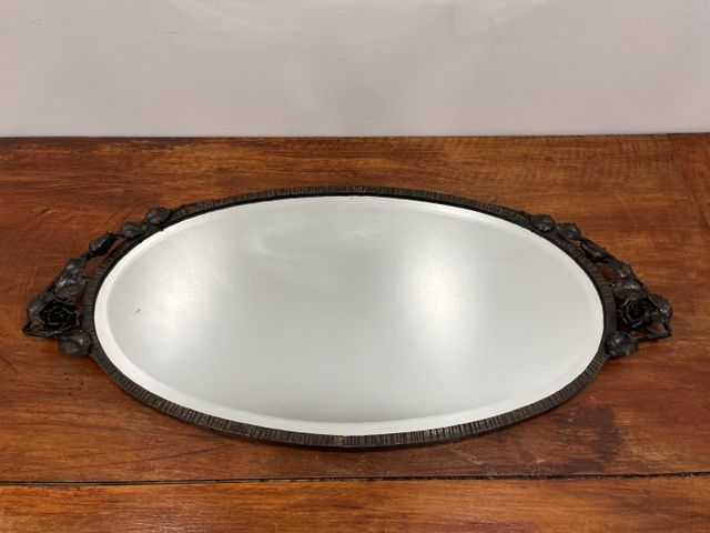 Miroir ovale en fer forgé martelé de style Art Déco à décor de fl...