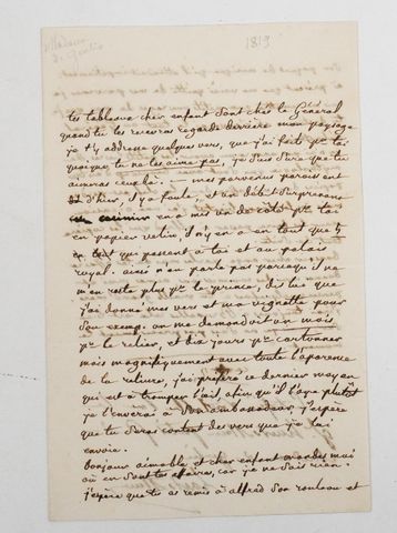 Missive adressée par Madame de Genlis à son petit-fils, Anatole Charles Alexis de Becelaere et de La Woestine, fils de sa fille aînée, Caroline, qui mourut en le mettant au monde en 1786. Son livre "Les Parvenus ou Les Aventures de Julien Delmours" venant d'être publié chez Casimir Baecker (son fils adoptif), elle lui envoie un des exemplaires sur vélin "il n'y en a que 5 en tout qui passent à toi et au palais royal." Il est aussi fait mention dans cette lettre du Général Sébastiani chez qui Mme de Genlis enverra les "petits ouvrages" qu'elle destine à son petit-fils. Elle demande à ce dernier de lui donner de ses nouvelles : "parles moi de tes affaires donnes moi des commissions, aimes moi et penses quelquefois à ta vieille grand'mère…".