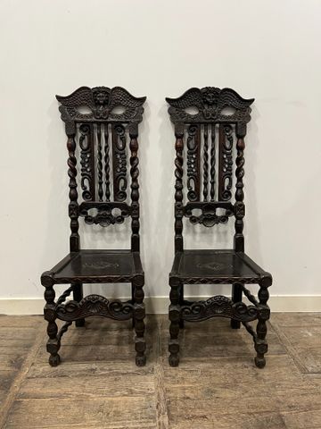 Paire de chaises en bois naturel mouluré, tourné et sculpté à déc...