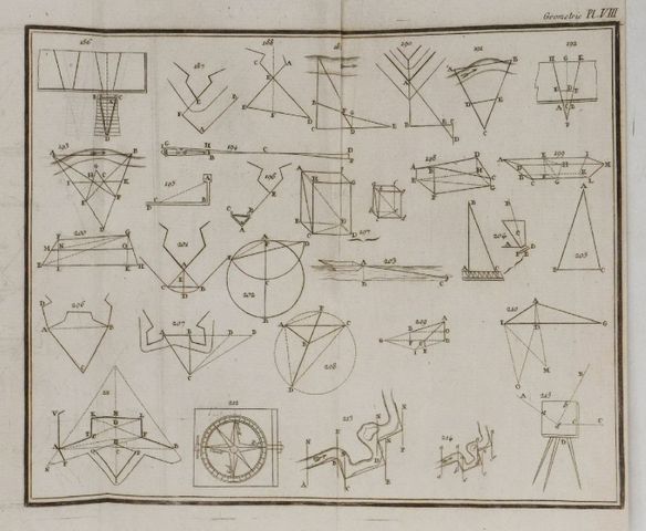 Tomes 1 à 3 consacrés à l'arithmétique (avec 1 tableau dépliant), la géométrie (avec 9 planches gravées dépliantes), et l'algèbre (avec 5 planches gravées dépliantes). Bon exemplaire.