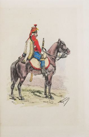 Exemplaire sur papier vergé, avec 1 tiré à part en rouge des 8 vignettes en tête de chapitre, 1 tirage en rouge de chacun des 4 portraits et 6 tirages aquarellés de planches d'uniforme.