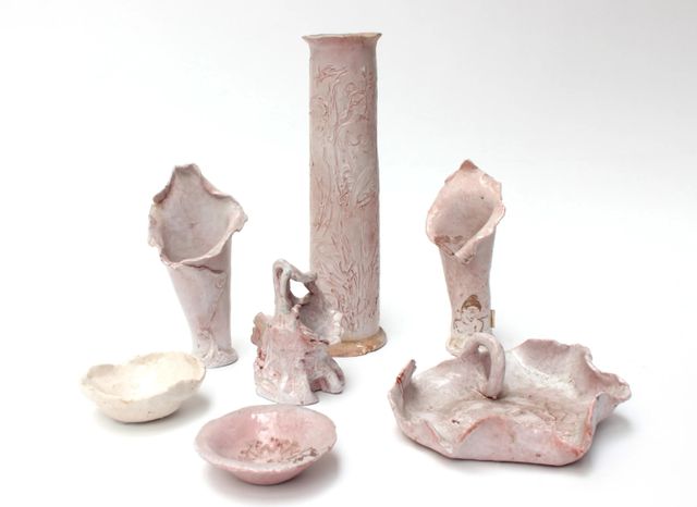 Vase rouleau (H 27.5 cm), deux vases cornets (H 18,5 cm), vide-poche (6 x 17 x 16 cm), deux coupelles (D 10 cm) et un élément sculpté (H 11,5 cm)