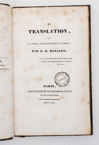MAGALON (J. D.). Ma translation ou La Force, Sainte-Pélagie et Poissy. Paris, Chez les principaux libraires de France et de l’étranger, 1824.