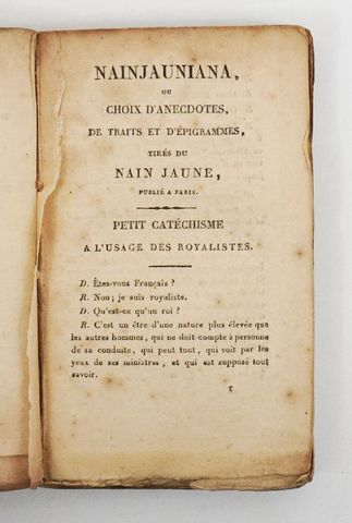 [Nain Jaune]. Nain Jauniana ou Choix d'anecdotes, de traits et d'épigrammes tirés du Nain Jaune, publié à Paris, et du Nain Jaune réfugié, publié à Bruxelles, terminé par le Chansonnier du Nain jaune. Bruxelles, A. Wahlen, 1817.