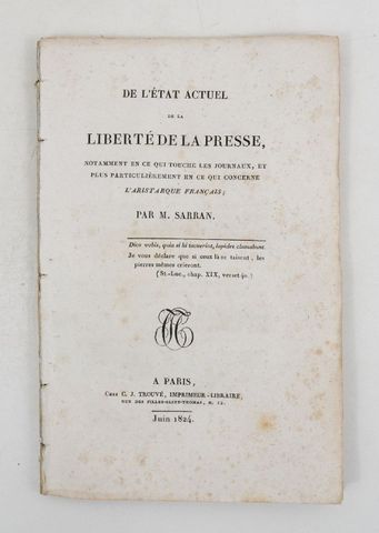 SARRAN. De l’État actuel de la Liberté de la Presse, notamment en ce qui touche les journaux, et plus particulièrement en ce qui concerne L’Aristarque français. Paris, Trouvé, Juin 1824.