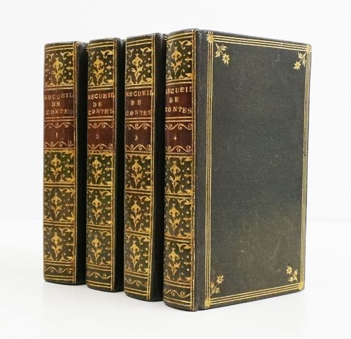 4 vol. in-16, maroquin vert, dos lisses richement ornés, triple filet doré encadrant les plats avec motif floral en écoinçons, filet doré sur les coupes, roulette intérieure dorée, tranches dorées (reliure de l'époque).