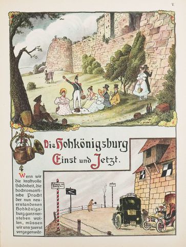 Die Hohkönigsburg im Wasgenwaldund ihre Einweihung [Le Haut-Kœnigsbourg dans les Vosges et son inauguration]. 16 Bilder von Hansi. Texte von Prof. Dr Knatschke. Mulhouse, Ch. Bahy, (1908).