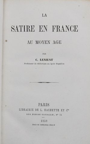 LENIENT (C.). La Satire en France au Moyen Âge. Paris, Hachette, ...