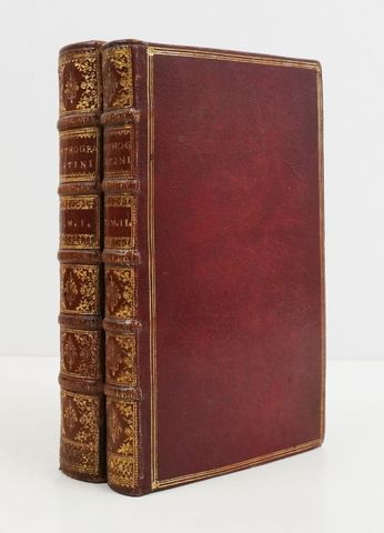 2 vol. in-8, maroquin rouge, dos à nerfs richement ornés, triple filet doré encadrant les plats, roulette dorée sur les coupes, doublure intérieure de maroquin rouge avec large dentelle en encadrement, tranches dorées (reliure de l'époque).
