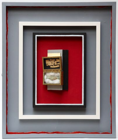 Coffret en bois doré à l'acrylique renfermant une amulette égyptienne, dédicacé et signé sur papier collé à l'intérieur du couvercle, une chromolithographie figurant une nativité sur le couvercle, présenté dans un montage à triple encadrement de Vincent Pécaud
