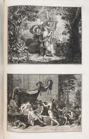 Belle édition, recherchée à cause des gravures dont elle est ornée, de cette traduction donnée par l'abbé Banier. Elle est illustrée d'un frontispice par Picart, de 2 fleurons sur les titres par Overbeke, gravés par Malder & Gouwen, d'une vignette en-tête gravée par Bernaert, d'une grande lettrine, de 124 figures in-texte à mi-page par Lebrun, Leclere, Maas, Picart, Prunt, Romain, Tosca, De Wit & Wandelaar gravées par Bouche, Bouttats, Folkema, Gunst, Jungmann, Schenk & Wandelaar ainsi que de 3 grandes planches hors-texte contenant chacune 2 belles figures par Lebrun gravées par Folkema. (Cohen 768 ; Brunet IV, 285.)