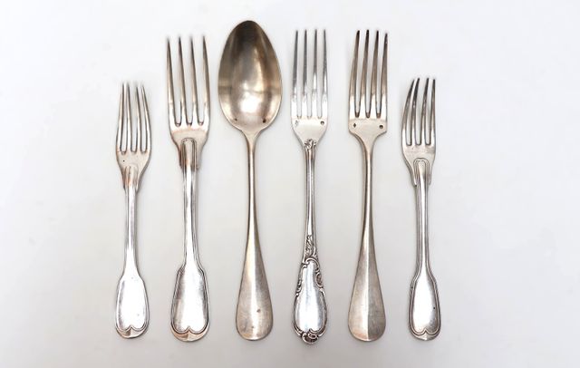 On y joint également deux fourchettes à entremets modèle filet à spatule chiffrée LB surmonté d'un heaume de chevalier en argent Sterling 925°/°° (Londres)