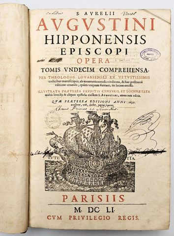 SAINT AUGUSTIN. S. Aurelii Augustinini Hipponensis episcopi Opera Tomis undecim comprehensa per theologos Lovanienses ex vetustissimis codicibus manuscriptis... in lucem emissa. Illustrata præterea eruditus censuris et locupletata multis homiliis... S. Augustini, antea non editis. , [Compagnie du Navire] , 1651. Parisiis, [Compagnie de la Grand’Navire], 1651.