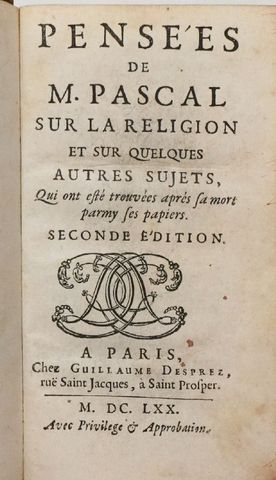 PASCAL (Blaise). Pensées de M. Pascal sur la religion et sur quelques autres sujets, qui ont esté trouvées après sa mort parmy ses papiers. Seconde édition. Paris, Desprez, 1670.