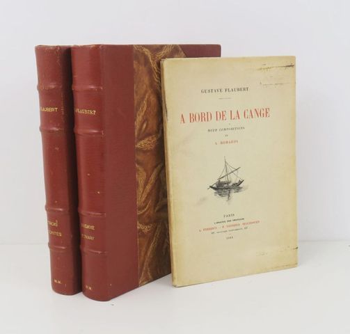 CHAHINE (Edgar) & FLAUBERT (Gustave). Madame Bovary, mœurs de province. Paris, Rombaldi, 1935. In-8 demi-chagrin havane à coins, dos à nerfs, titre doré, initiales M.M. en queue. 5 compositions en couleurs hors texte d'E. Chahine. Ex. n°222. On y ajoute du même auteur, même éditeur, en reliure similaire : Trois contes. 1936. Tirage limité à 3000 ex. numérotés (n°93). 6 compositions couleurs hors texte par CHAHINE, CHIMOT et LOBEL-RICHE. Qqs petits frottés au dos. On y ajoute également du même auteur : À bord de la Cange. Paris, Ferroud, 1904. In-12 broché, couv. illustrée rempliée. 9 compositions de A. ROBAUDI dans et hors texte. Tirage à 350 ex. ; n°210 des 200 sur vélin d'Arches. Bon ex.