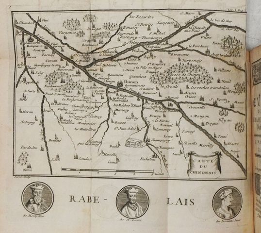 Ouvrage illustré d'un titre-frontispice gravé par Scotin, d'un portrait de Rabelais, de 3 planches gravées dépliantes, d'une carte gravée dépliante du pays de Chinon, et d'une figure dans le texte (p. 257 du tome V).