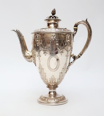 Verseuse sur piédouche en métal argenté à riche décor en relief de frises de perles, feuilles d'acanthe, guirlandes fleuries festonnées alternées de mascarons et décor gravé de noeuds rubannés retenant un médaillon orné d'armoiries (blason de gueules à une bande d'argent chargée de trois têtes de tigres, au chef chargé d'un arbre), frétel à décor de pomme de pin