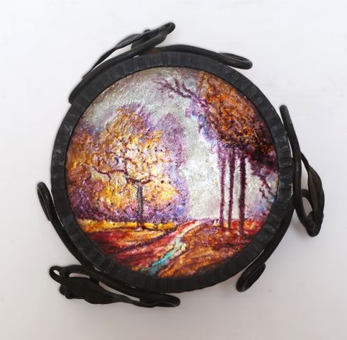ERVEL LIMOGES Petite coupe émaillée sur cuivre à décor polychrom...