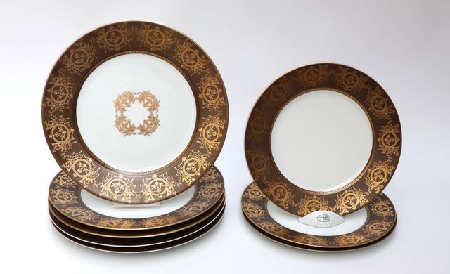 Suite de 8 assiettes en porcelaine dure blanche à large aile, décorées à l'or de quatre blasons réunis au centre et de grands et petits blasons alternés en bordure sur un large bandeau bronze comprenant 3 assiettes de présentation à large bassin (D. 31 cm), 2 assiettes de présentaiton à petit bassin (D. 31,5 cm) et 3 assiettes à dîner (D. 28 cm)