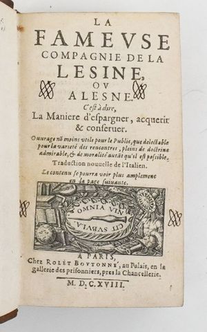 Anonyme. La Fameuse Compagnie de la Lesine, ou Alesne. C’est-à-dire La Manière d'espargner, acquerir et conserver. [...] Traduction nouvelle de l'Italien. Paris, Rolet Boutonné, 1618.