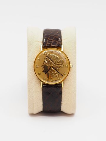 Montre bracelet d'homme type Coin Watch à boîtier rond en or jaune 750°/°°, cadran signé à l'effigie d'une tête de la Liberté marquée LIBERTY d'après le modèle de James Barton LONGACRE (194-1869) présent sur les monnaies or de 1 et 20 dollars frappées au XIXème siècle, index étoiles formant les heures, boîtier cannelé, couronne ornée d'un cabochon, fond vissé et numéroté, mouvement mécanique à remontage manuel, bracelet cuir à boucle ardilon en métal doré