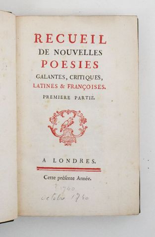 [Anonyme & Collectif]. Recueil de nouvelles poésies galantes, critiques, latines & françoises. Londres, sn, cette présente Année [octobre 1740].