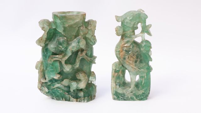 CHINE Deux sujets en fluorite sculptée comprenant un vase à décor...