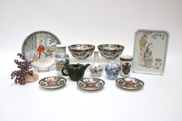 Lot de pièces dépareillées en porcelaine comprenant un petit vase pansu en porcelaine à décor bleu/blanc rehaussé de rouge de fer figurant un dragon à cinq griffes pourchassant la perle sacrée, marque au revers (H. 9 cm), une assiette circulaire à décor d'une scène d'intérieur animée (Diam. 21,5 cm), deux bols à décor de cods (H. 7 cm - Diam. 15,5 cm), une timbale à décor armorié dans le goût de la Compagnie des Indes (H. 10 cm), deux petits vases de forme bouteille et balustre à décor de scènes animées (H. 13 / 16 cm), trois soucoupes (Diam. 12 cm), un plateau rectangulaire à décor d'une jeune femme (fin XIXème - 24 x 17 cm - cassé recollé)