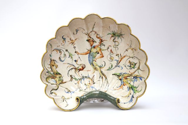 Grande coupe tripode formant coquille en faïence à décor polychro
