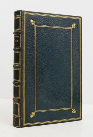 In-4, maroquin turquoise, dos à nerfs orné, sextuple filet doré encadrant les plats avec motifs floraux en écoinçons, double filet doré sur les coupes, doublure de maroquin turquoise à décor de filets et de feuillages dorés, tête dorée, couv. conservées, sous emboîtage (Magnin).