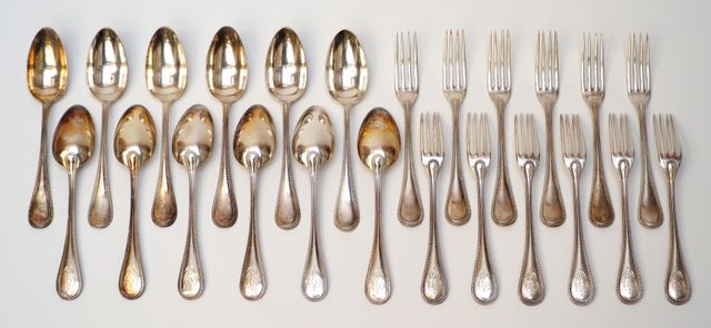 12 couverts à entremêts en argent 950°/°° à décor de frises de pe...