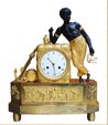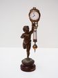 Pendule en régule à patine brune et dorée sur socle en bois à l'i...