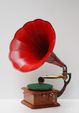 Phonographe à pavillon en tôle peint en rouge, caisse en bois ver...