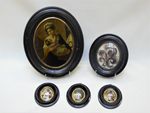 Lot de quatre miniatures en cheveux et un fixé sous verre représe...